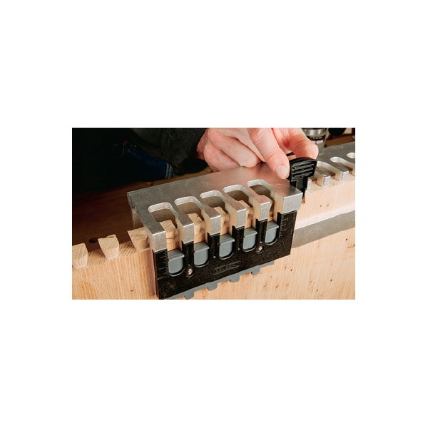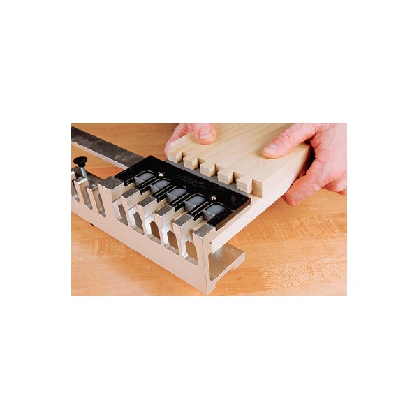 Aside from its almost pocket-change price there are several more things I really like about this jig. Since it doesn’t capture stock left to right, it will accept workpieces of any width, from drawers to big chests. A little aligning tool clips into the fingers to reset it for each series of cuts.