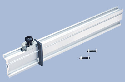 The 20" Aluminum Miter Gauge Extension attaches to your miter gauge face via rear T-Slots with two bolts and knurled knobs. The adjustable stop slides to the left or right in a top-mounted T-Slot and can be flipped up or down when needed. The extension (with stop) slides left or right on the gauge face to allow repetitive cut-offs up to 20" long.