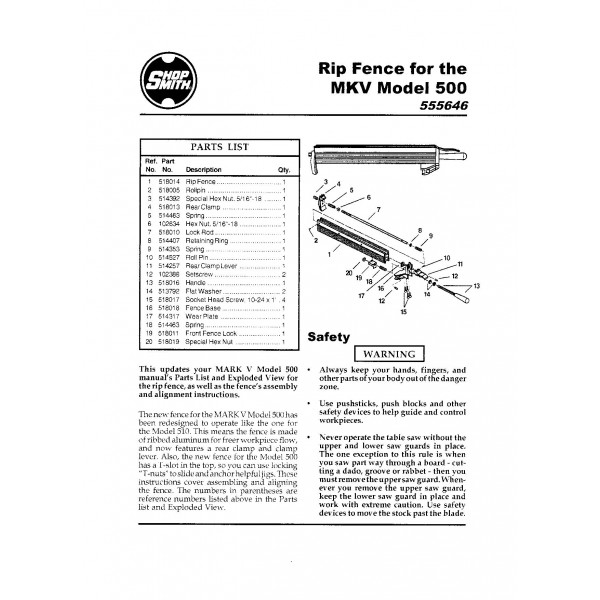 Owners Manual for Mark V Model 500 Rip Fence Upgrade (PDF) (on request)